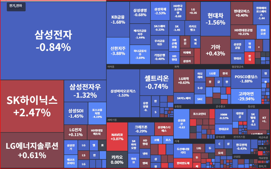 다만 이틀 연속 차익매물을 소화한 SK하이닉스의 상승 재개와 함께 기계, 의류, 유통 등이 상승하며 업종간 차별적 흐름을 전개했습니다.