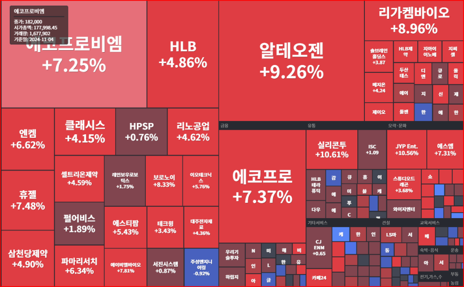리가켐바이오 (+8.96%)/알테오젠 (+9.26%)/보로노이 (+8.33%)/에이비엘바이오 (+7.81%)